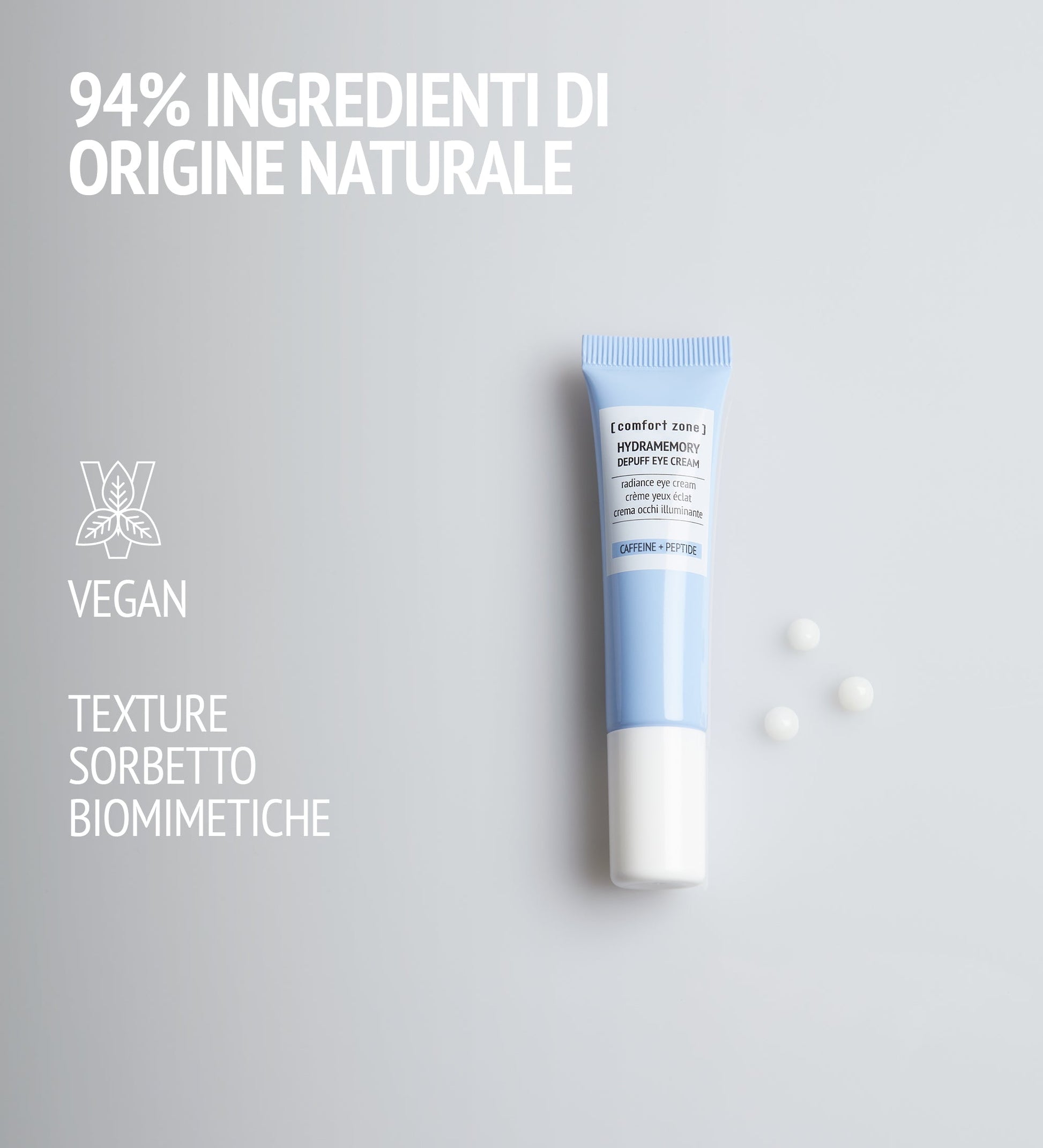 Crema per il contorno occhi antiborse e idratante, formulata con caffeina e un peptide specifico per il contorno occhi (ACETYL TETRAPEPTIDE-5) e in una texture biomimetica per uno sguardo riposato. Formula vegana clinicamente testata per migliorare l'aspetto di occhiaie, borse e linee sottili di disidratazione. Risultati? Il contorno occhi risulta più luminoso, levigato e idratato.