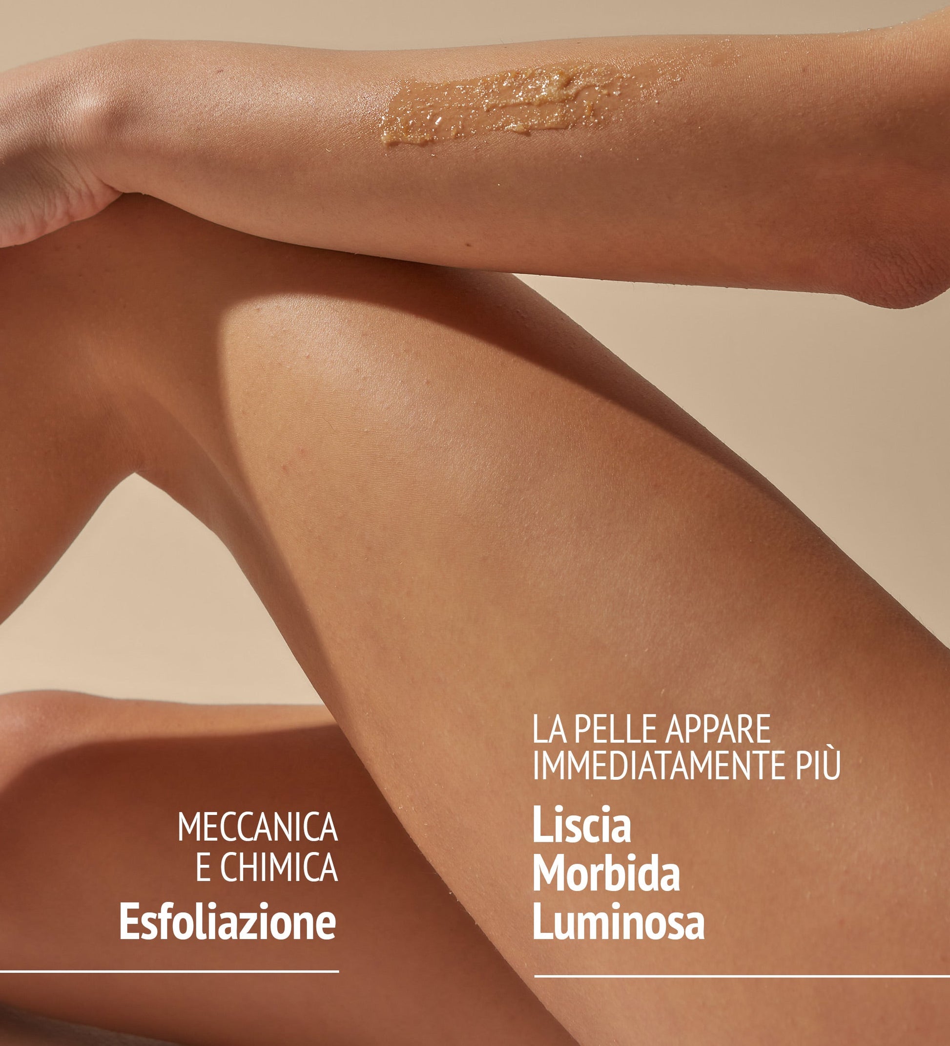 Scrub corpo formulato con particelle naturali di Silice, Scorza d'Arancia e 10% di Alfa-Poli-Idrossiacidi per una doppia azione esfoliante sia chimica che meccanica.
